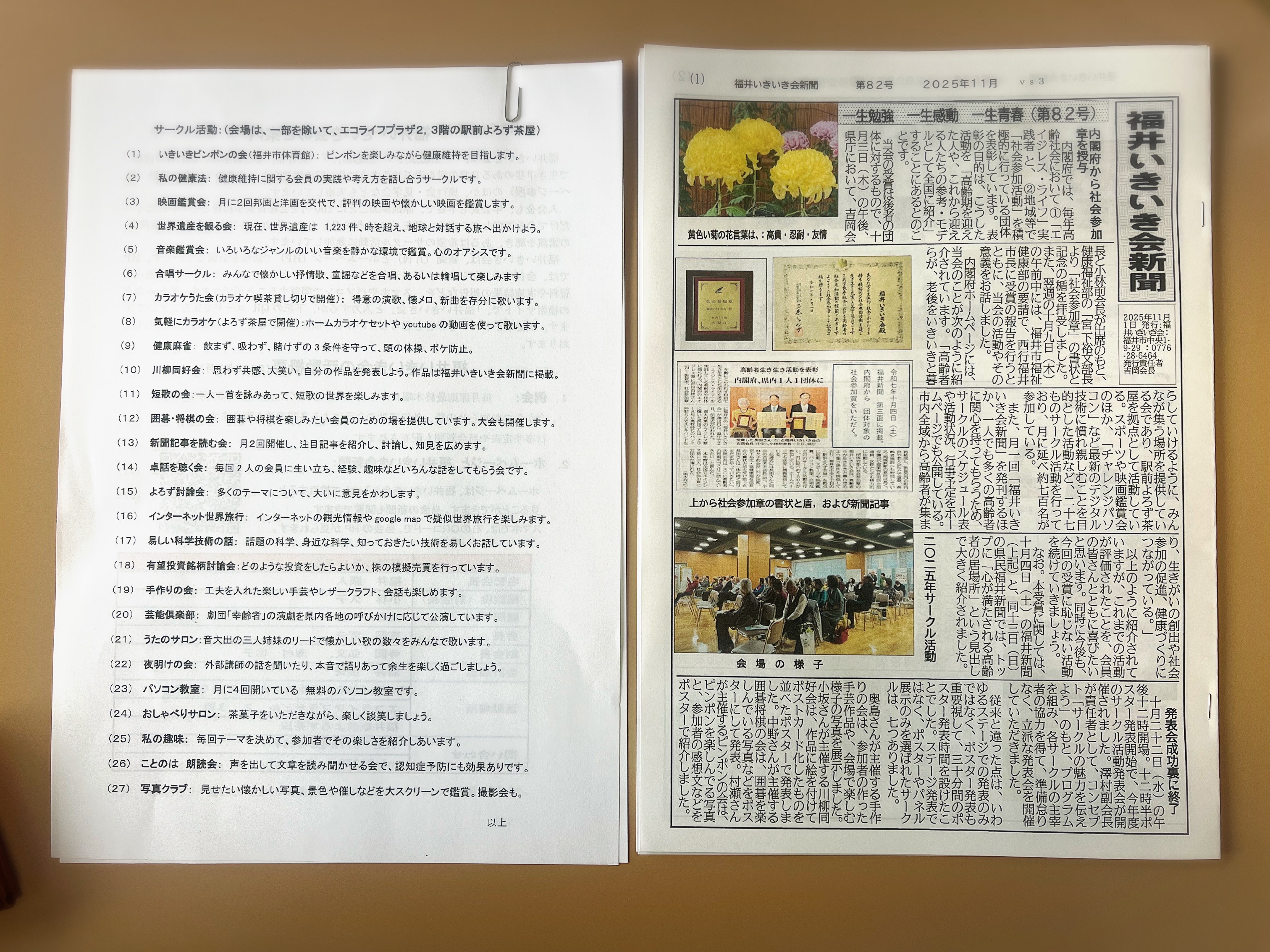 また、会報誌として「福井いきいき新聞」 を2019年から発行されています。最新号はなんと82・ 83号合併号。1号あたり4~5ページにもなる新聞には、 それぞれの活動や会員さんのお話などぎっしり情報が掲載されてい ます。