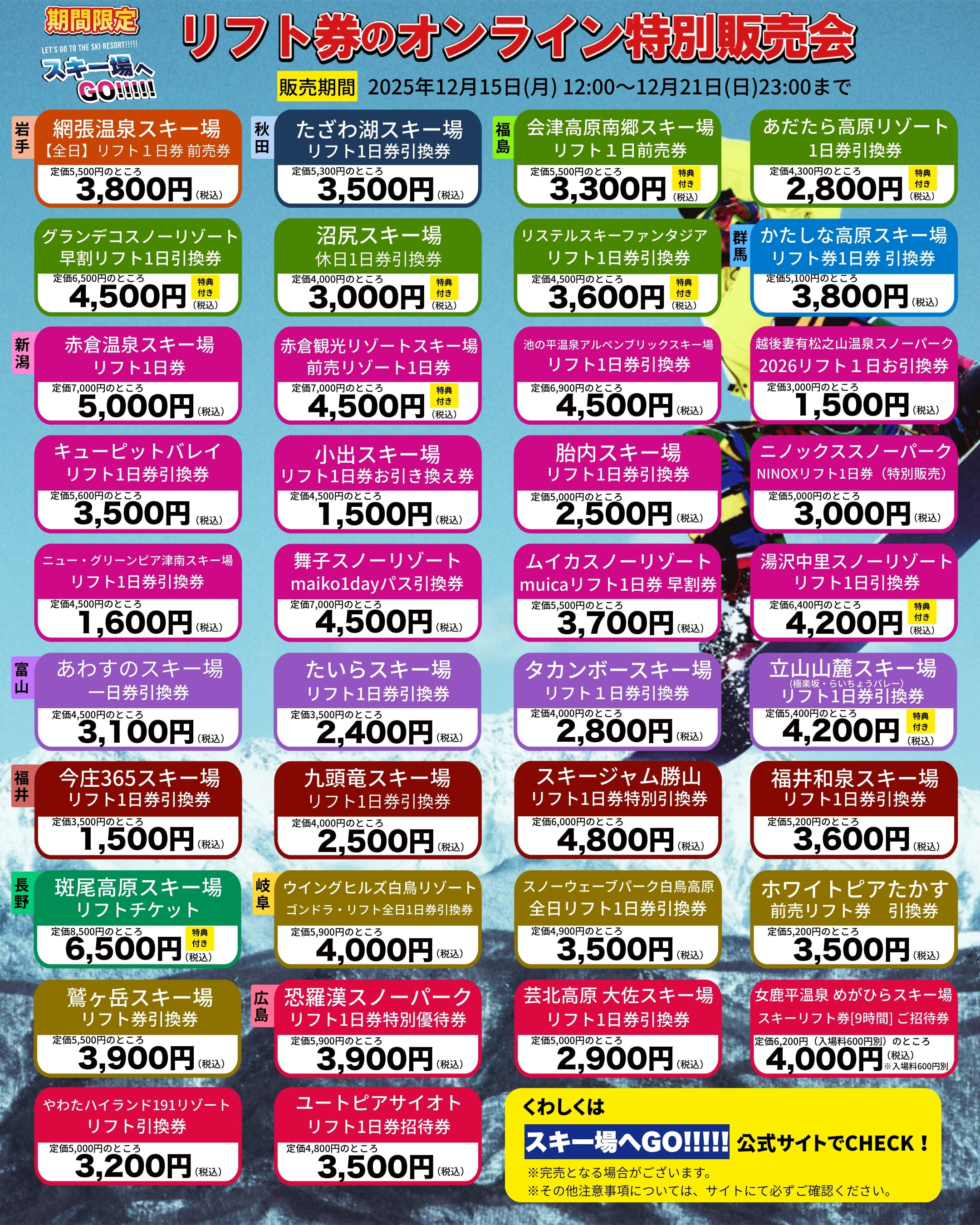 そのほか、東北や北陸のとってもお得なスキー場リフト券を特別価格で販売します。