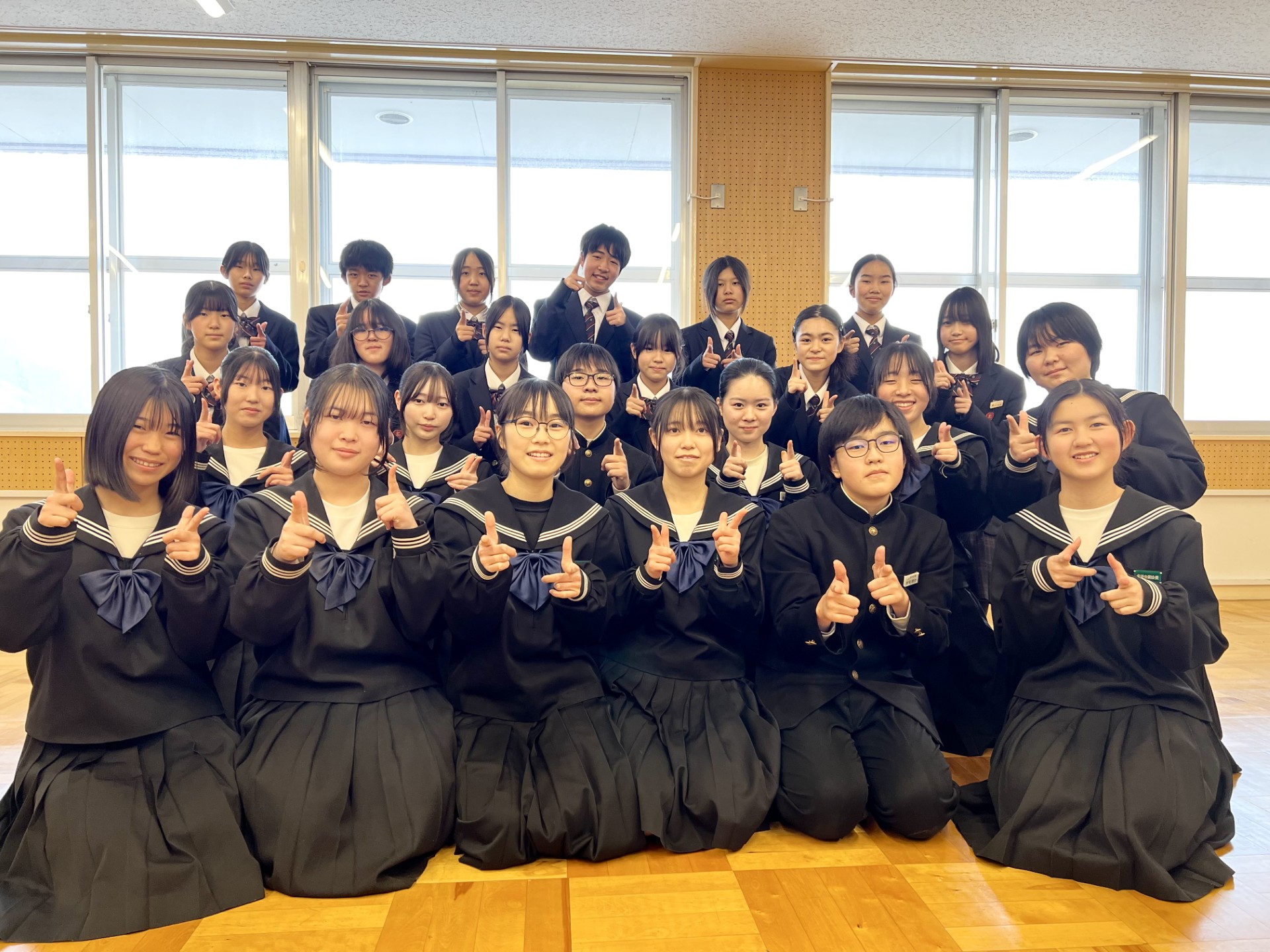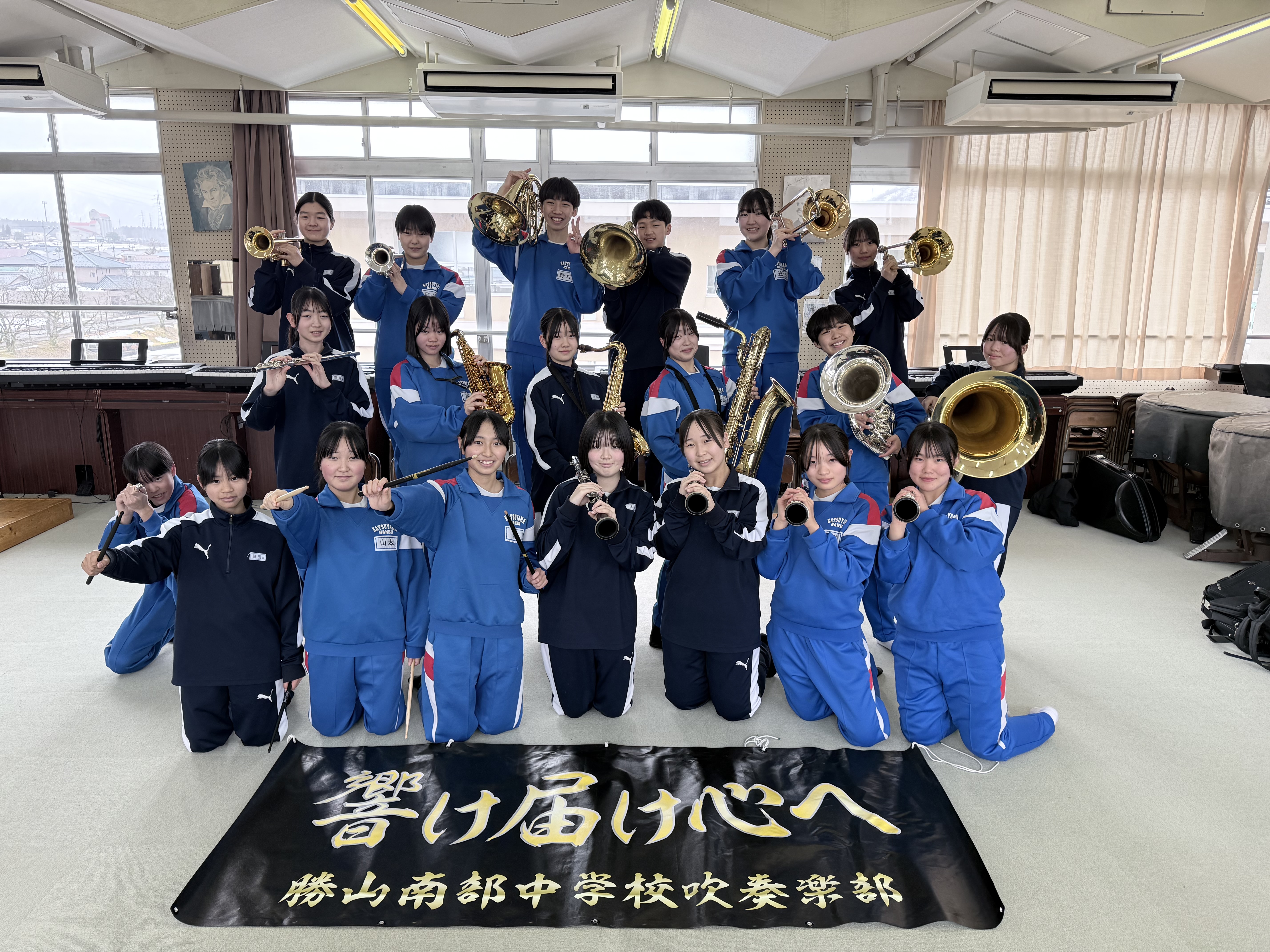 勝山南部中学校吹奏楽部は、1年生10名、2年生12名の計22名で活動しています。「響心奏魄~心を動かせ~」をスローガンに掲げ、日々練習に取り組んでいます。私たちは、聴きに来てくださる方への感謝の気持ちを大切にしながら、皆さんの心を動かせる演奏を目指しています。また、あいさつや返事、仲間との協力も大切にし、一人ひとりが吹奏楽部員としての自覚を持って活動しています。本日は、皆さんの心に残る演奏をお届けできるよう、精いっぱい頑張ります!
